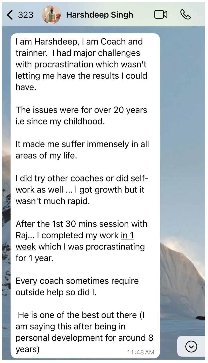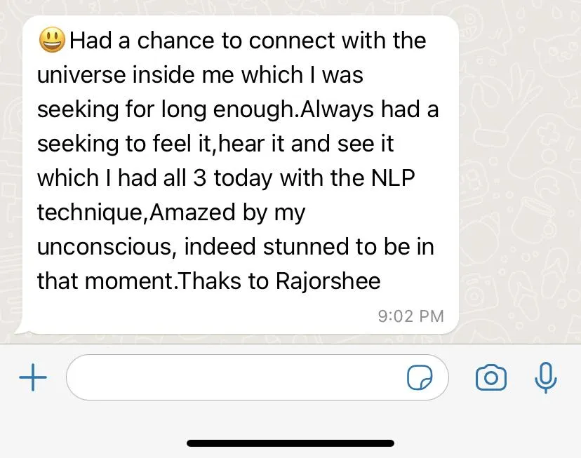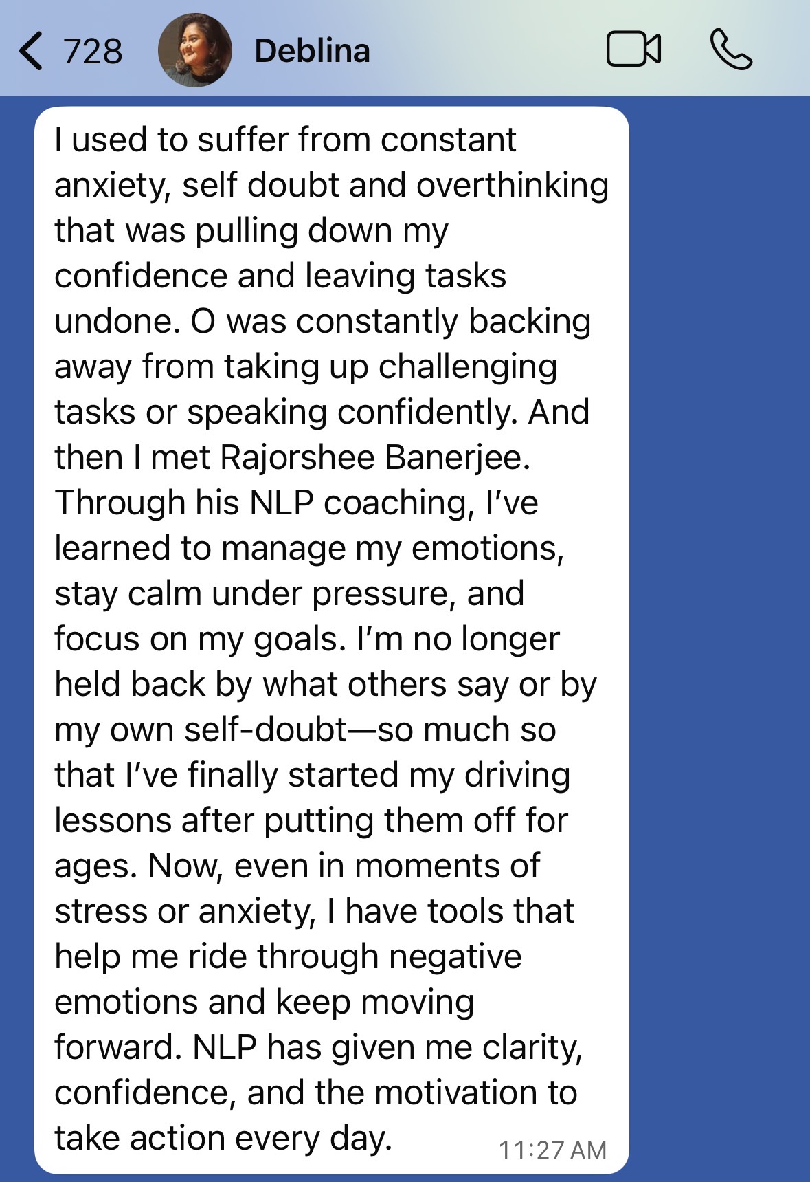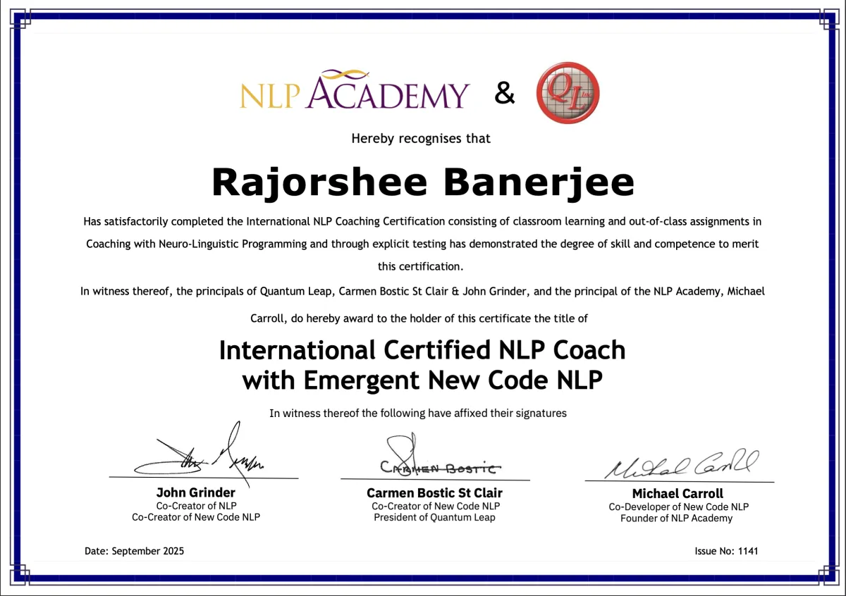 Disclaimer: We do not provide medical, emergency, or clinical mental health care. NLP Coaching is recommended for Personal Growth, Emotional Wellbeing, Productivity & Performance Enhancement, Overcome Challenges like Burnout & Chronic Stress, Self-doubt & Limiting beliefs, Procrastination, Fears, Overthinking, Childhood trauma. For mental health challenges and clinical mental health, medical intervention by a Medical Health Practitioner is highly recommended. This Coaching can however supplement your medical treatment in building daily coping mechanisms without daily dependence on a practitioner.