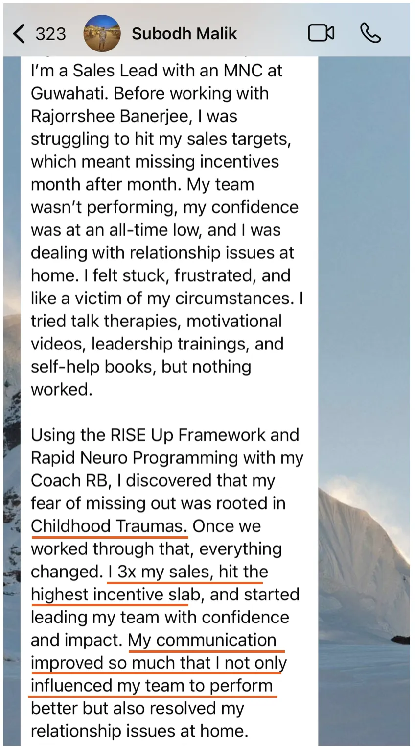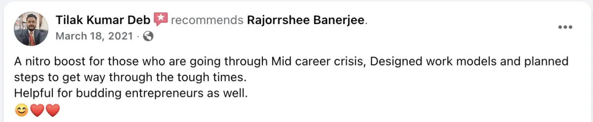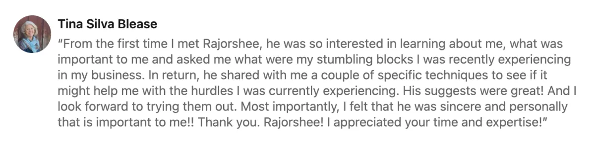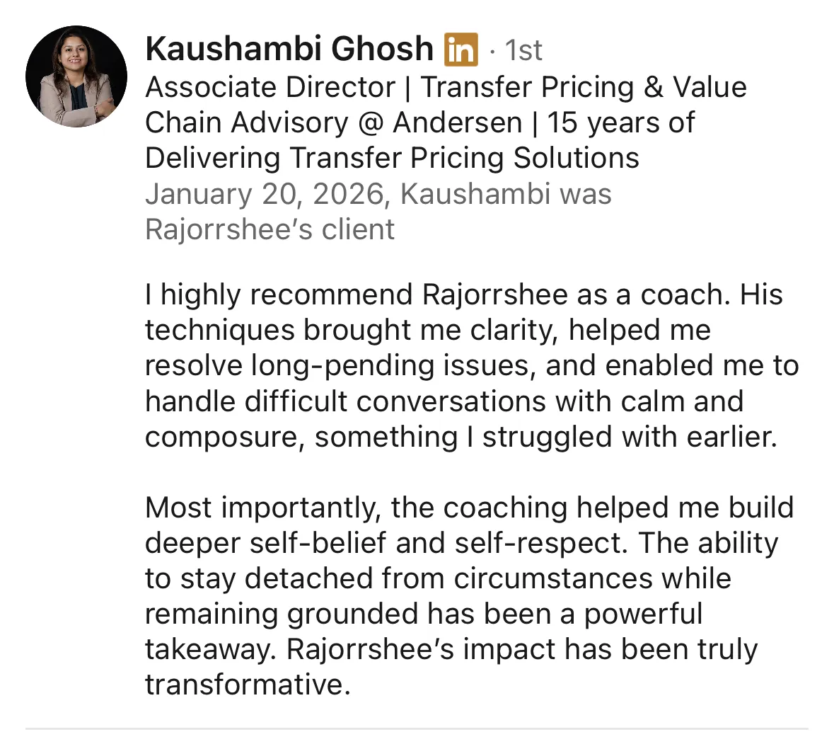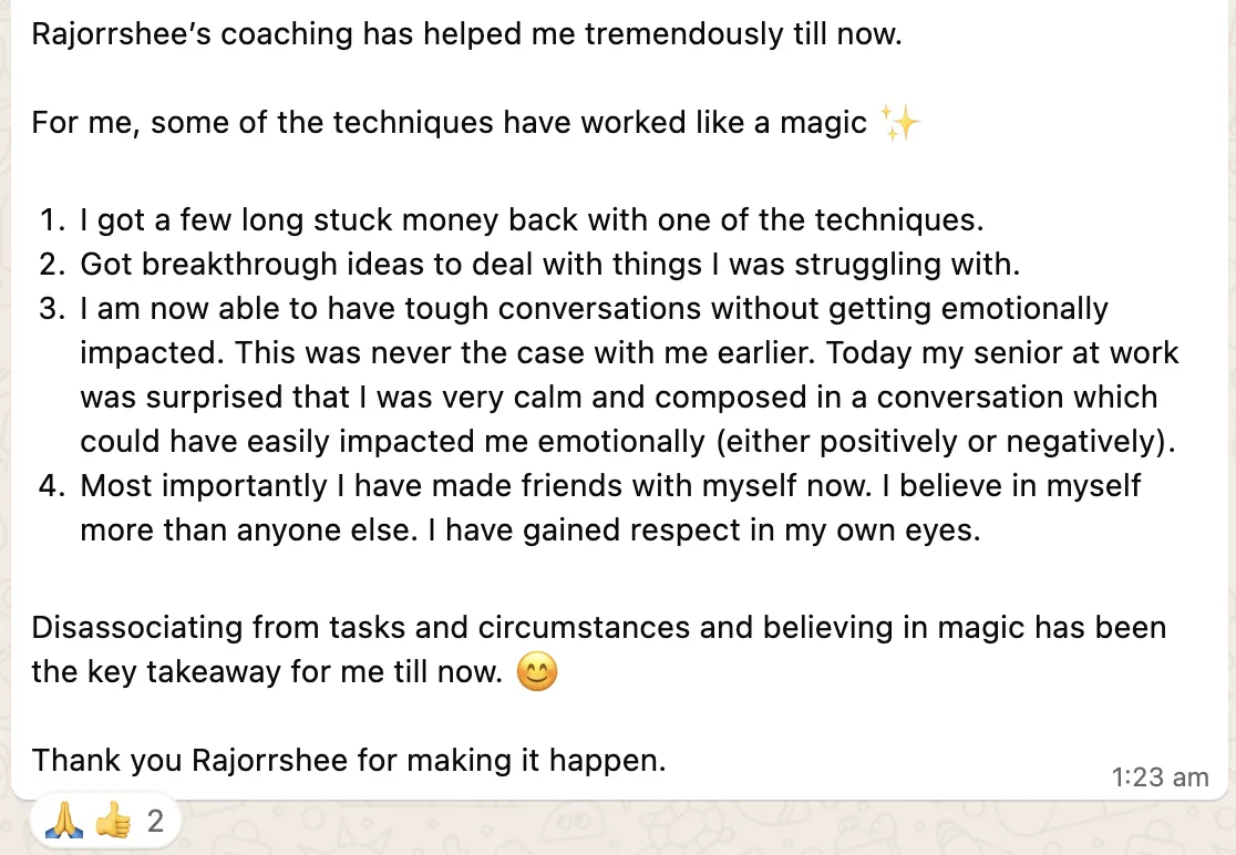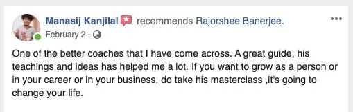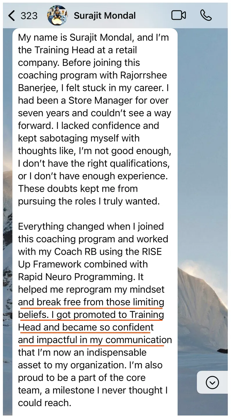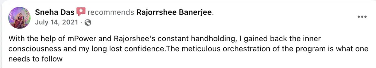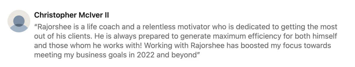 Rajorshee Banerjee is a International Certified NLP Coach. He believes, with the coaching, individuals can be better prepared to navigate through life by mastering their Mindset, Emotions and Beliefs. But we do not guarantee 100% results in our coaching. Results vary, are not typical, and rely on individual effort, time, and skill, as well as unknown conditions and other factors.
